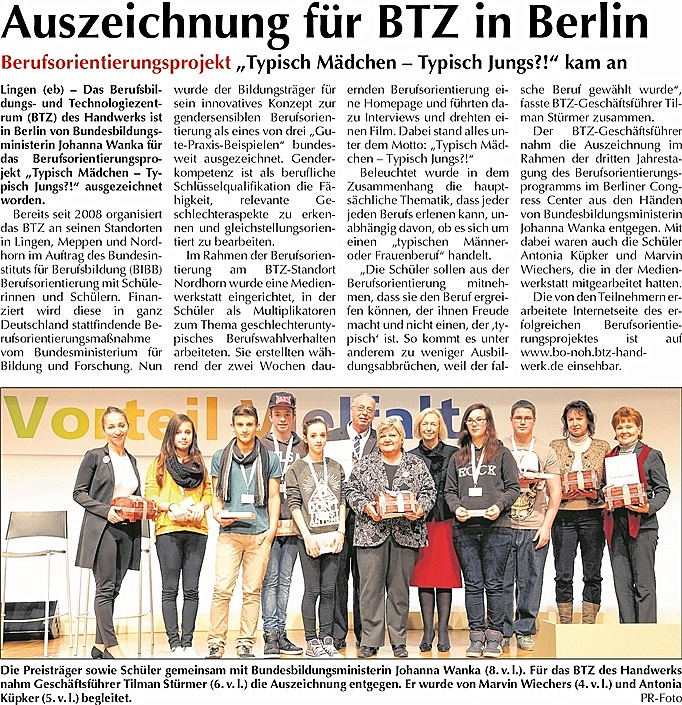Im Dezember 2013 wurde das BTZ für sein Berufsorientierungsprojekt "Typisch Mädchen - Typisch Jungs?!" in der Medienwerkstatt während der Werkstatttage im BTZ in Nordhorn ausgezeichnet. Aus den Händen von Bundesbildungsministerin Johanna Wanka nahm der damalige BTZ-Geschäftsführer Tilman Stürmer die Auszeichnung im Berliner Congress Centrum entgegen. Mit dabei waren auch die Schüler Antonia Küpker und Marvin Wiechers, die in der Medienwerkstatt mitgearbeitet hatten.