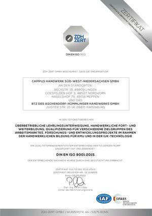 Die Campus Handwerk Süd-West Niedersachsen GmbH hat bereits Mitte der 1990er Jahre in seinen Bildungsstätten ein umfassendes Qualitätsmanagementsystem entwickelt, eingeführt und durch das ZDH-Zert zertifizieren lassen. Im Jahr 2001 wurde es als einer der bundesweit ersten Bildungsdienstleister mit eigener Produktentwicklung, nämlich unseren Bildungsprodukten, zertifiziert. 2017 wurde das Qualitätsmanagementsystem der aktuellen internationalen Norm DIN EN ISO 9001:2015 angepasst.