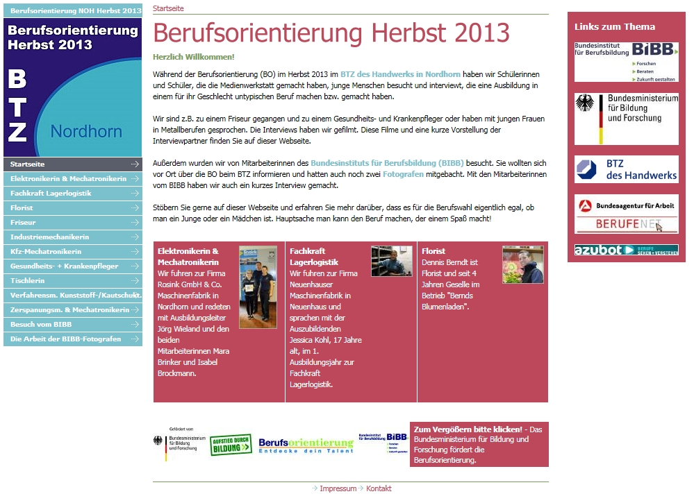 Im Herbst 2013 produzierten die Teilnehmenden eine kreative Homepage mit spannenden Clips über junge Menschen, die geschlechteruntypische Berufe erlernt haben. Für dieses Projekt wurde der Campus Handwerk vom Bundesinstitut für Berufsbildung (BIBB) ausgezeichnet.